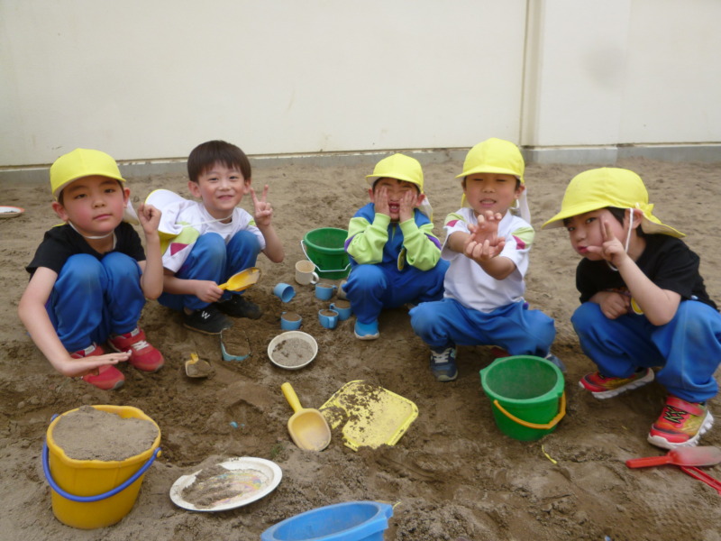 天気が良い日は、外遊びをしました!砂でごはんやジュースを作ってままごとをしたり、虫や幼虫探しを楽しんだりしましたよ。新しいお友達の名前を呼んで遊びに誘ったり、協力して一つのものを作ったりするなど、少しずつ新しいクラスに慣れてきた子どもたちです!