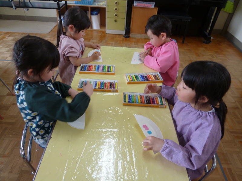 お部屋では制作遊びを楽しんでいます。ひまわり組は、箱などの様々な材料を使ってかばんやおうちを作りました!紙コップでこまを作ってこまバトルをするなど、思い思いに楽しむ姿が見られました!たんぽぽ組は、紙皿にはじき絵をして傘を作ったり、和紙を染めてきれいなレインコートを作ったりしました。6月になったら玄関に飾るので楽しみにしていていくださいね!