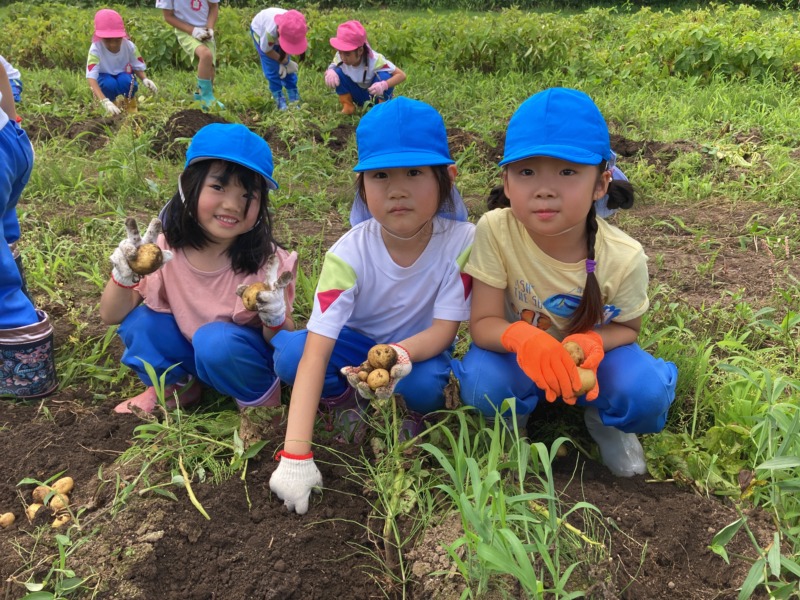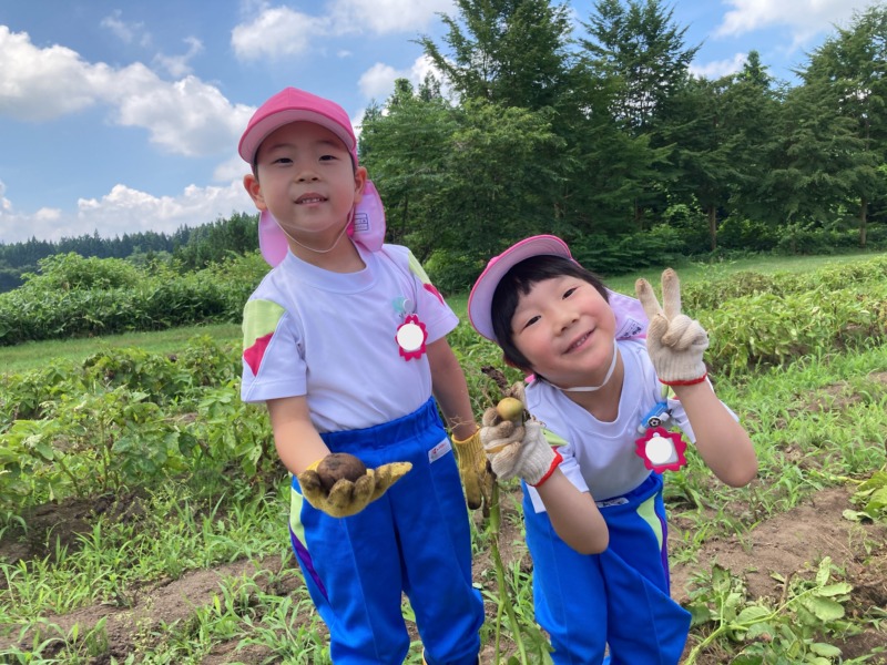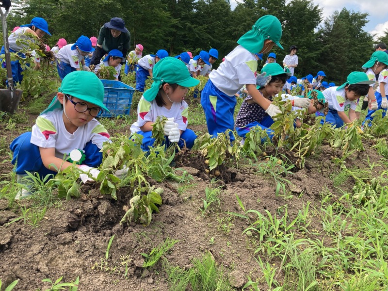 7月8日(火)、御山野楽校にじゃがいも掘りに行って来ました!御山の先生に掘り方を教えてもらい、じゃがいもの葉の下を掘ってみると次々に大きなじゃがいもが出てきて大興奮!たくさん収穫でき、帰りのバスではどんな料理にして食べようかみんなで話をして盛り上がっていたこどもたちでした😊また、自分たちが頑張って掘ったじゃがいもが給食に出ると、「甘いね!」「おいしいね!」と大喜びでおかわりをしてたくさん食べていました。