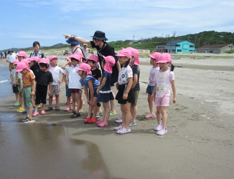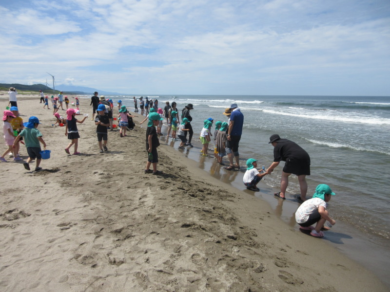 園外活動で下浜海水浴場に行って来ました。「海の向こう側はどこの国かな?」「ヤッホーすると聞こえるかな?」と力いっぱい「ヤッホー!」したり、海辺で波の音や匂いを感じたり、魚や綺麗な貝殻を見つけたりして喜んでいましたよ!男の子と女の子に分かれてクラス対抗で砂山づくり大会をしました。どのクラスが大きいかみんなで見比べて盛り上がっていましたよ!出来上がった砂山にはオリジナルの旗を立てて写真撮影もしました!穴を掘ると海水が湧き出てきたり、色々な形の貝殻があることを発見したりして、海でしか体験できないことばかり♪夏を感じてきました!