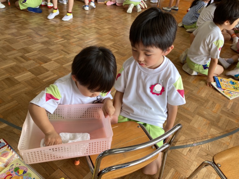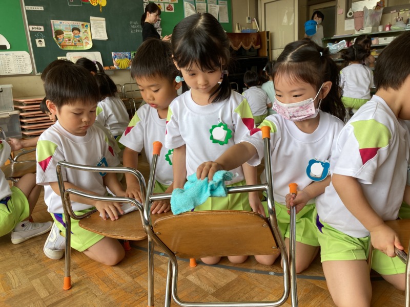 18日(金)には、大掃除をしました。1学期たくさん遊んだお部屋を隅々までピカピカにしました。また、大掃除が初めての年少さんのお手伝いも頑張りましたよ!「こうやるんだよ!」「次はここ拭いてね!」と教えてあげたり、ロッカーの荷物や靴を持つのを手伝ってあげたりして、優しく見守る姿が頼もしく見えました✨