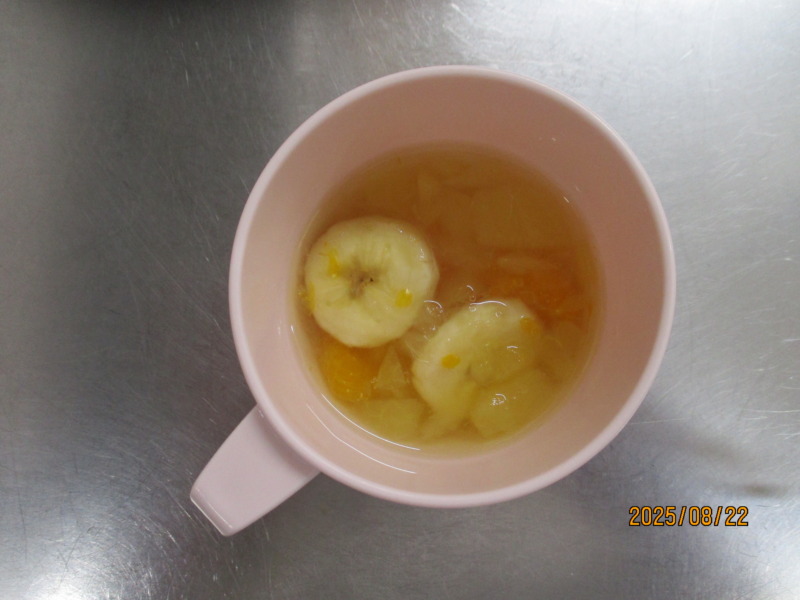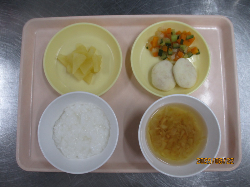 離乳食(後期)の給食は、おかゆ、スープ、コロッケ風、コロコロ野菜、りんごです。