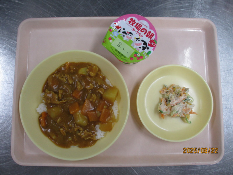 今日の給食は、ポークカレー、ツナマヨサラダ、ヨーグルト(いちご)です。