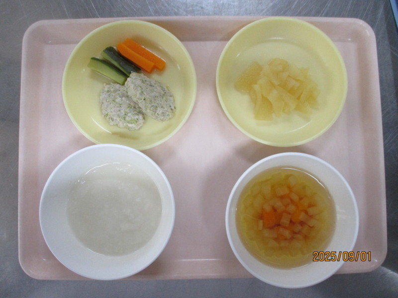 離乳食(後期)の給食は、パンがゆ、スープ、野菜ハンバーグ、野菜スティック、りんごです。