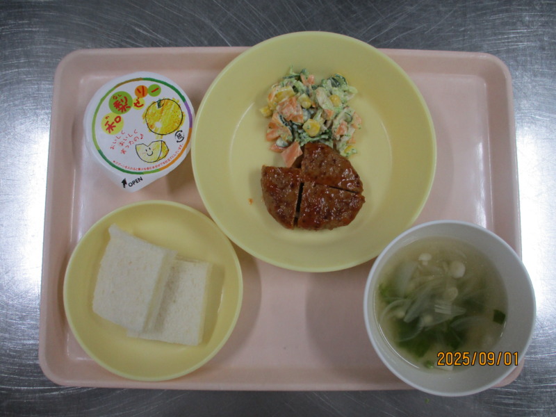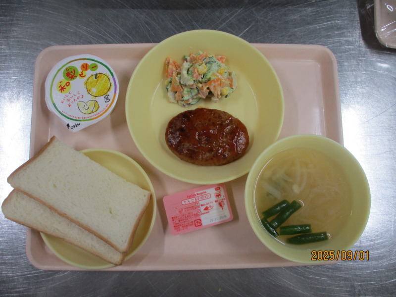 今日の給食は、食パン(りんご&マーガリン)、ハンバーグ(ケチャプ)、ちくわのサラダ、和梨ゼリー、牛乳、コンソメスープです。