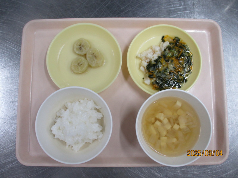 離乳食(後期)の給食は、おかゆ、スープ、カレイの野菜あんかけ、バナナです。