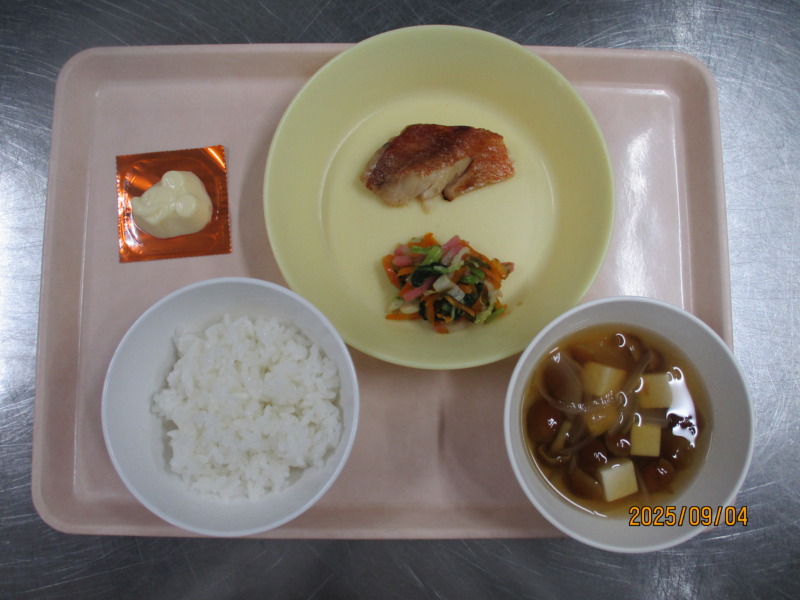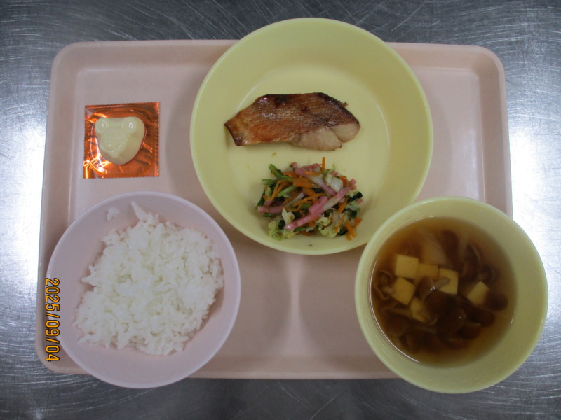 今日の給食は、ごはん、赤魚西京焼き、海苔和え、ディズニーチーズ、すまし汁です。