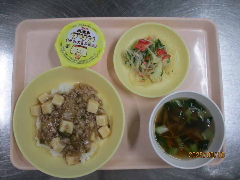 今日の給食は、麻婆丼、さっぱりサラダ、プリン、中華スープです。