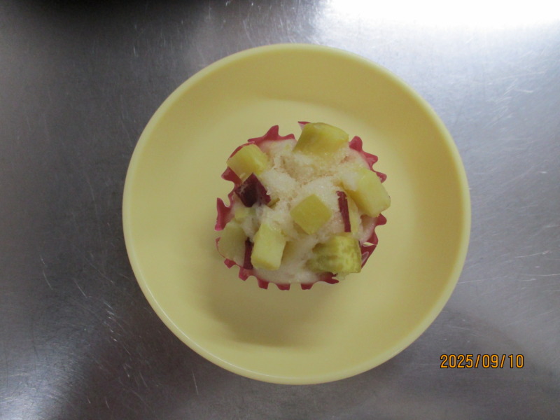 保育園の手作りおやつは、お芋蒸しパンです。