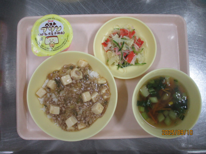 今日の給食は、麻婆丼、さっぱりサラダ、プリン、中華スープです。