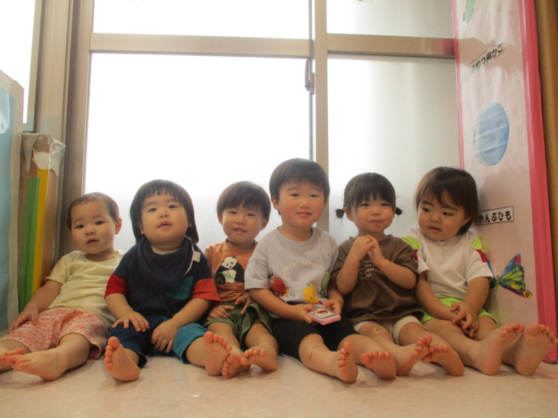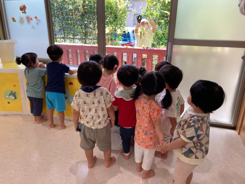 ゴーヤのグリーンカーテンを片付けている様子をお部屋の中から見つめているひよこ組さん。後ろ姿からも伝わるほど真剣な表情で見つめる姿がとてもかわいかったです♡