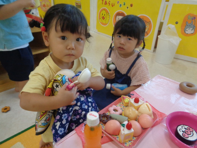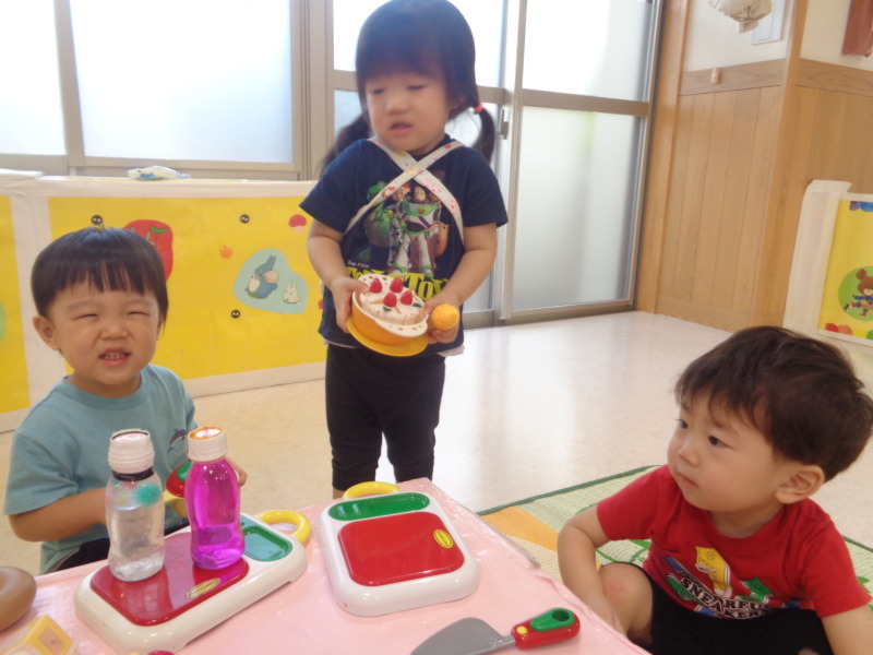 おままごとでは、ケーキを作ってお誕生日パーティーをしたり、ジュースで「かんぱーい!」と元気に楽しむ姿が見られました。最近では、お友達と遊ぶ姿も増え、顔を見合わせて笑ったり、手を繋いで仲良く遊んだりする微笑ましい場面も見られるようになってきました。