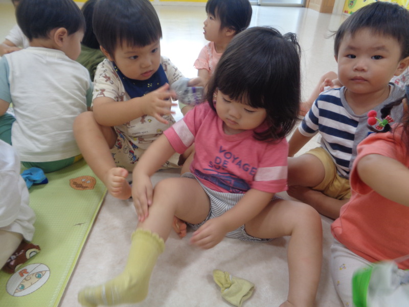 最近は靴下を自分で履こうと頑張る姿が増えてきました。かかとやつま先に苦戦しながらも、最後までやり遂げると「できた!」と嬉しそうに見せてくれる子どもたち!一生懸命に取り組む姿がとても微笑ましいです♡