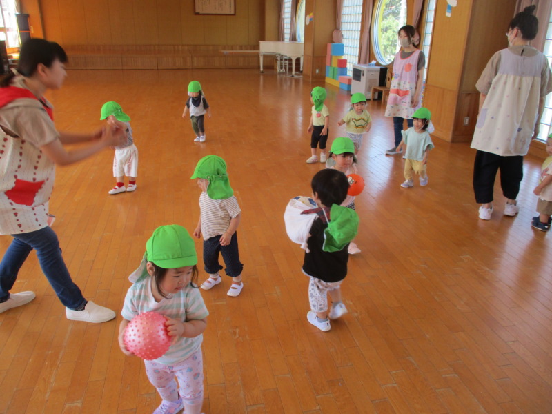 ホールでは、元気にボールを追いかけたり少し難しい一本橋に挑戦したりと運動遊びを楽しみました。先生の「よーいどん!」のかけ声で一生懸命走る姿も見られ、元気いっぱいに過ごしました!