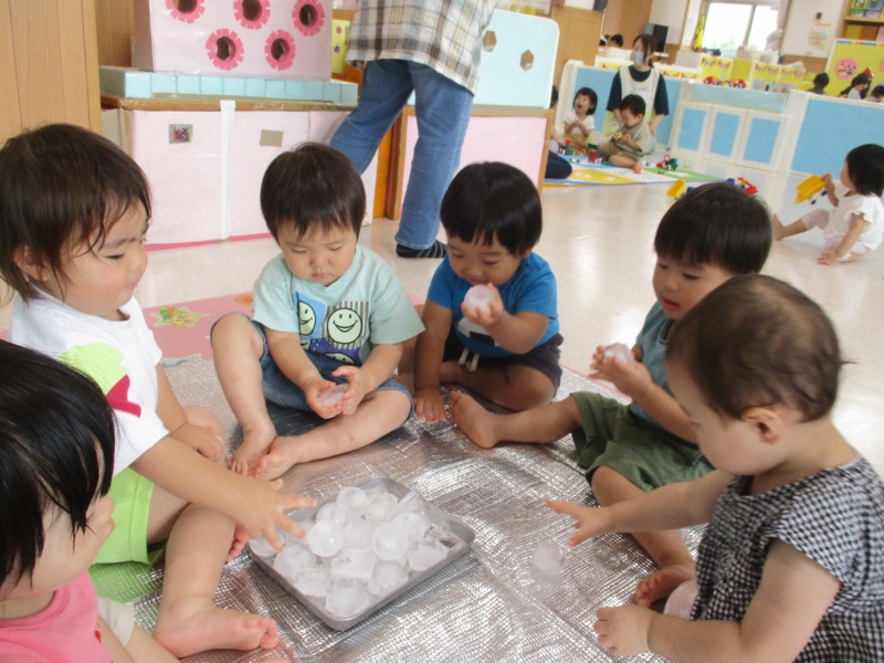 氷遊びでは、冷たさにびっくりして手を引っ込める子もいれば、氷をぎゅっと鷲掴みにして楽しむ子もいました。また、じっと氷を見つめて、少しずつ溶けていく様子に夢中になる姿も見られました。心地良い氷の冷たさや氷が解ける不思議さをいっぱいに感じながら夏ならではの遊びを楽しみました!