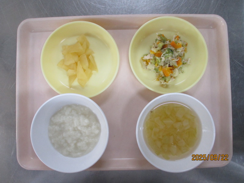 離乳食(後期)の給食は、パンがゆ、スープ、鶏と花野菜和え、りんごです。