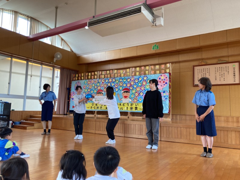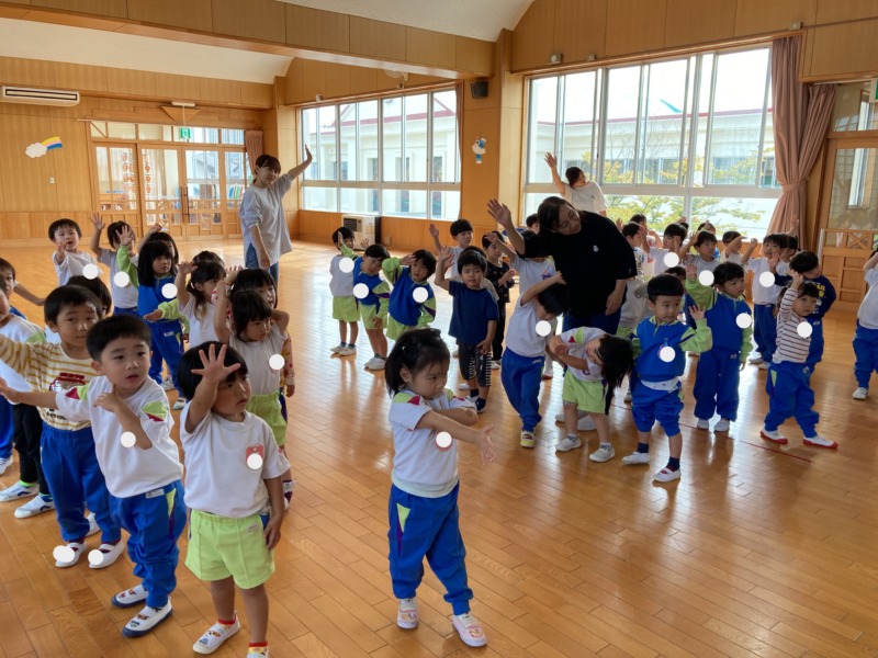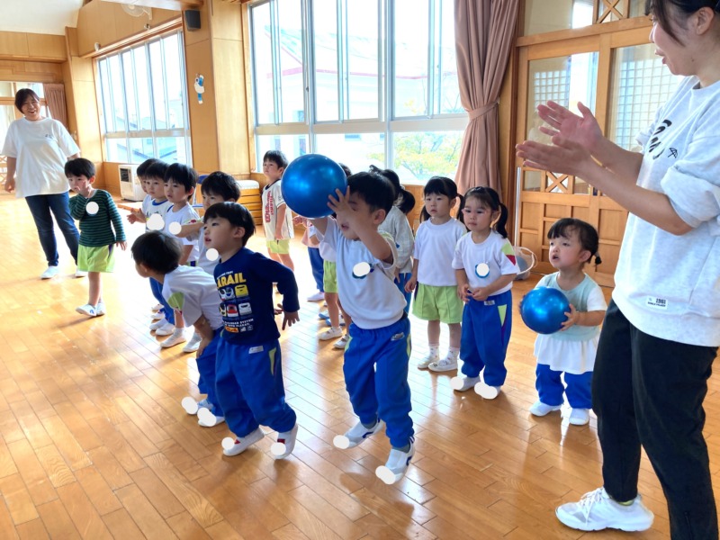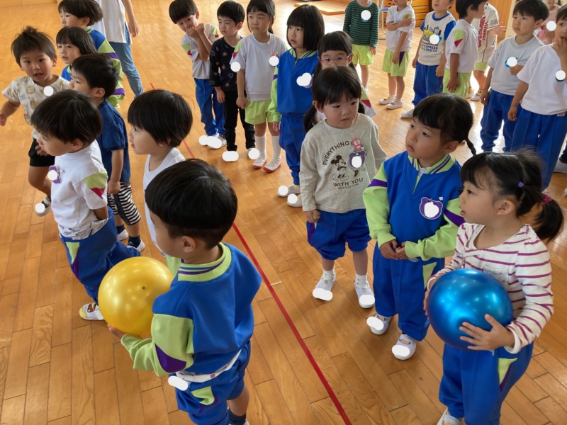 10月9日(木)に交通安全教室がありました。左右をよく見て確認するために、チームに分かれてボール送りゲームに挑戦しました。「勝つぞ~!!」と気合いたっぷりに盛り上がっていました♬