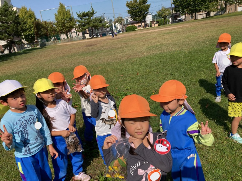 天気が良い日には、園庭や沼田公園で鬼ごっこや虫探しなどをして楽しんでいます。鬼ごっこでは、友達と冷蔵庫鬼や増やし鬼などいろいろな種類の鬼ごっこを楽しんでいます。コオロギやトンボを見つけると、そーっと近づいていく姿がかわいらしいです☆捕まえた時には大喜び!友達とじっくり観察しています♪