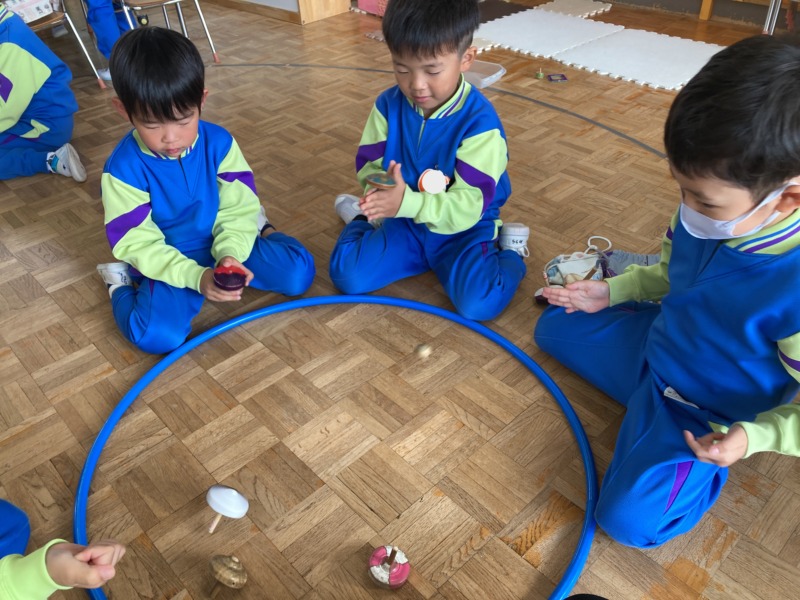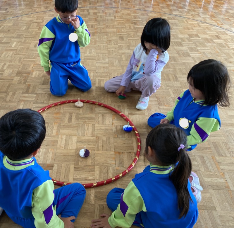 運動会でもらったこまに色をぬって、オリジナルのこまを作りました。自分だけのこまに特別感を味わっていた子どもたち。こまを回すと、「きれい~!」「むらさきになった!」と大興奮でした♪友達とどっちが長く回るか競争したり、上下反対に回したりしてたくさん楽しんでいますよ。
