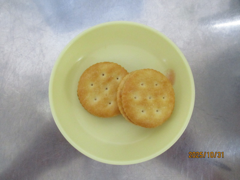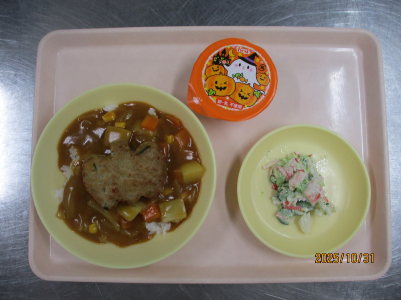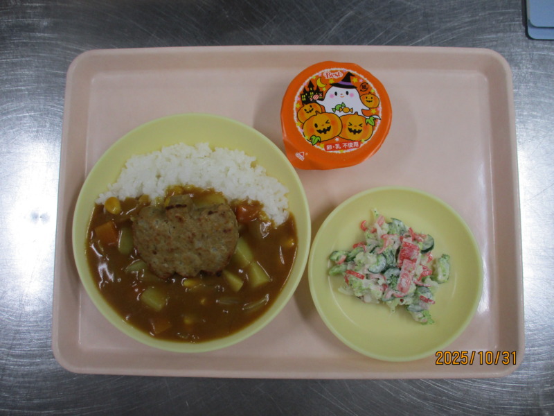 今日の給食は、ハロウィンバーグカレー、かにさんマヨサラダ、パンプキンババロアです。