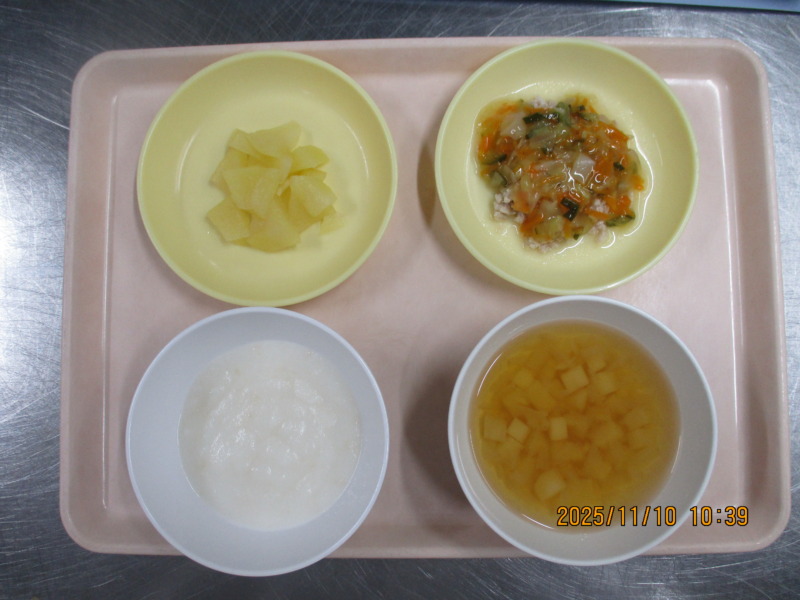 離乳食(後期)の給食は、パンがゆ、スープ、鶏ひき肉の野菜あん、りんごです。