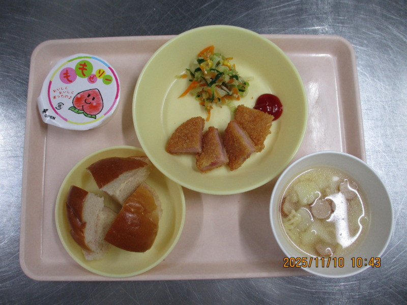 今日の給食は、パン(バターロール)、ABCスープ、ハムカツ、きゃべつのサラダ、ももゼリー、牛乳です。