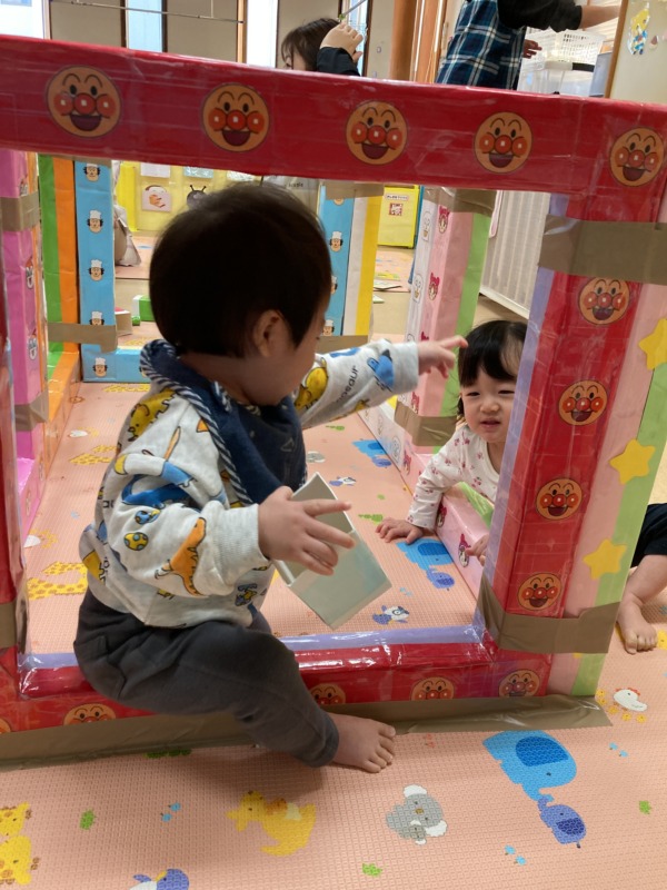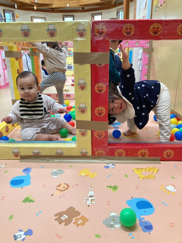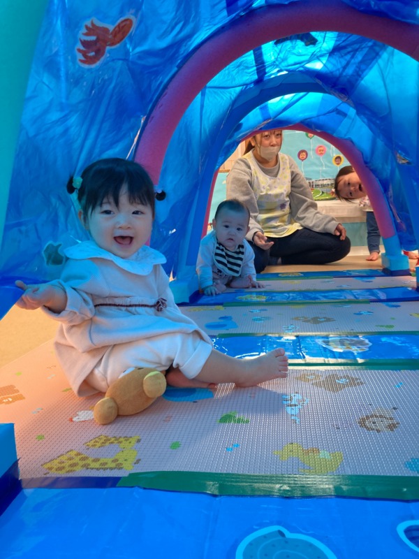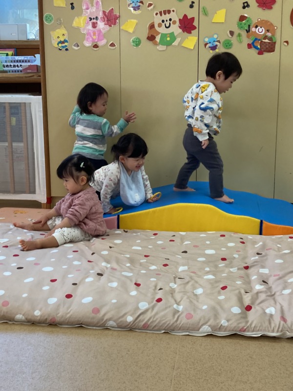 歩くことが上手になったお友達も増えて、ますます賑やかな雰囲気の中、お山のマットを登ったり、トンネルをくぐって「まてまて~!」をしたり、たくさん体を動かして楽しんでいます♪