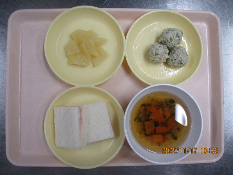 今日の給食は、食パン(いちご&マーガリン)、肉団子、ごまマヨサラダ、かぼちゃのスープ、ぶどうゼリーです。