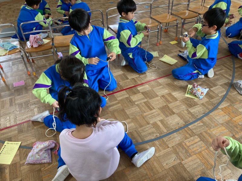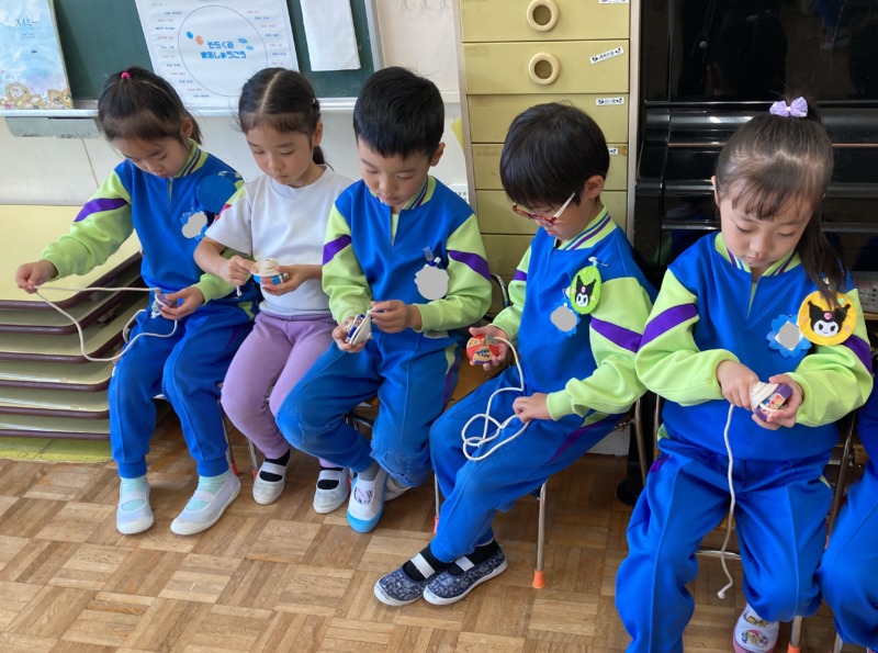 こまカードにのっている色々な技を習得するために、何度も繰り返し取り組んでいます!まずは一つ目の技の“どんぐりのようにきれいに巻ける”を習得し、こまを回せるように頑張っていますよ😊友達同士で教え合いながら技に挑戦中です🌟