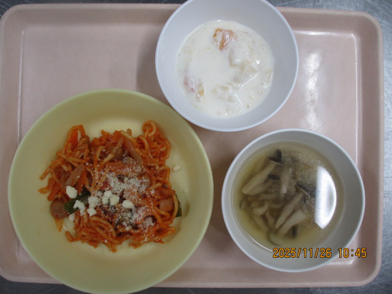 スパゲッティナポリタン 今日の給食は、スパゲッティナポリタン、きのこスープ、フルーツヨーグルトです。 きのこスープのしめじがちょっぴり苦手な子もいましたが、頑張って食べる様子が見られました。ナポリタンはお口の周りを真っ赤にしながらおいしい~と言って食べていました♪ 離乳食(後期)の給食は、米がゆ、スープ、野菜入り肉だんご、りんごです。 保育園の手作りおやつは菜めしおにぎりです。