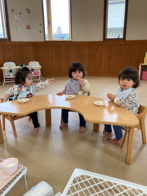 食事も後期食から幼児食に移行するお友達が増え、テーブルとイスに座っておいしくたべていますよ!