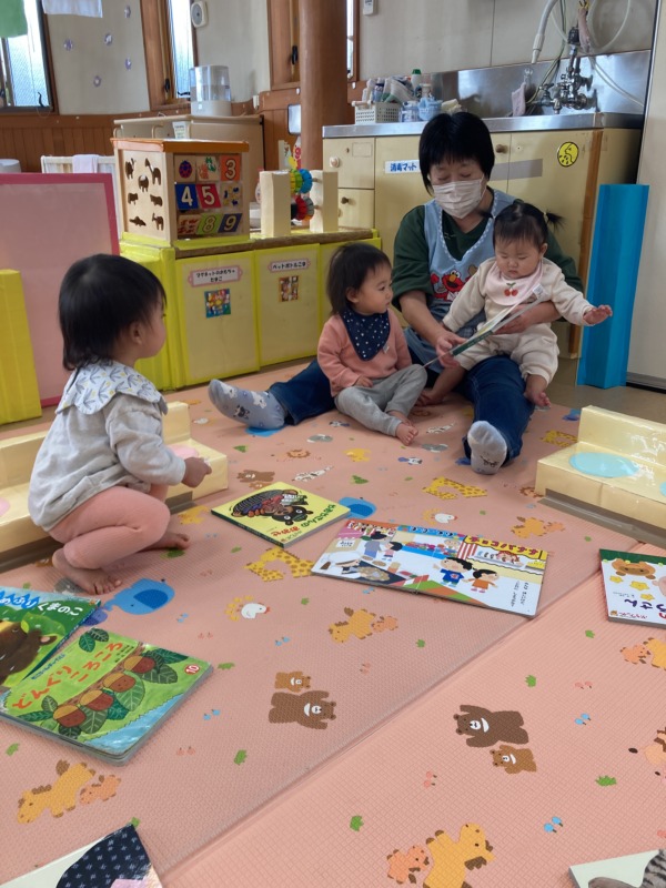 絵本が大好きなたまご組さん。保育者の膝に座ってゆったり絵本タイム♪言葉も出てきたお友達もいるので、言葉を繰り返して言いながら発語を楽しんでいます♪