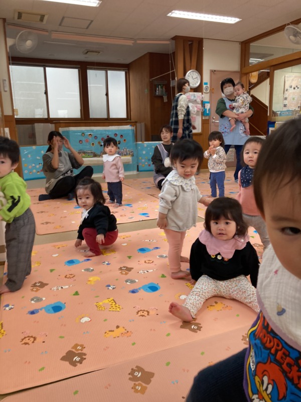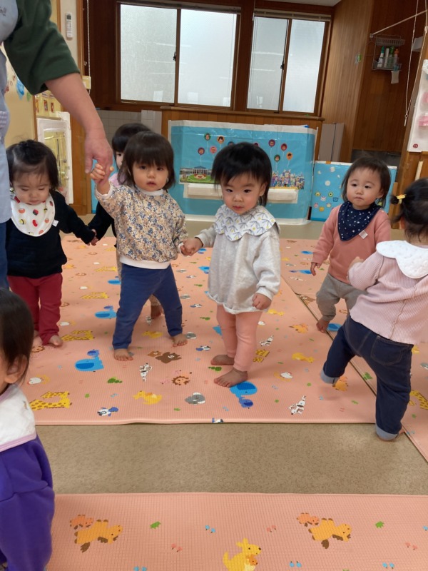 室内で「ハイホー」やしまじろうの「手と手をつないで」トトロの「さんぽ」を流しながらお散歩遊びをすると、保育者や友達と一緒に「手を繋いで嬉しそうに遊ぶ姿が見られます。