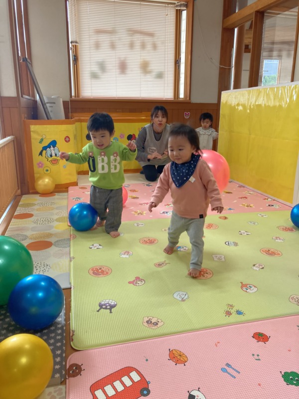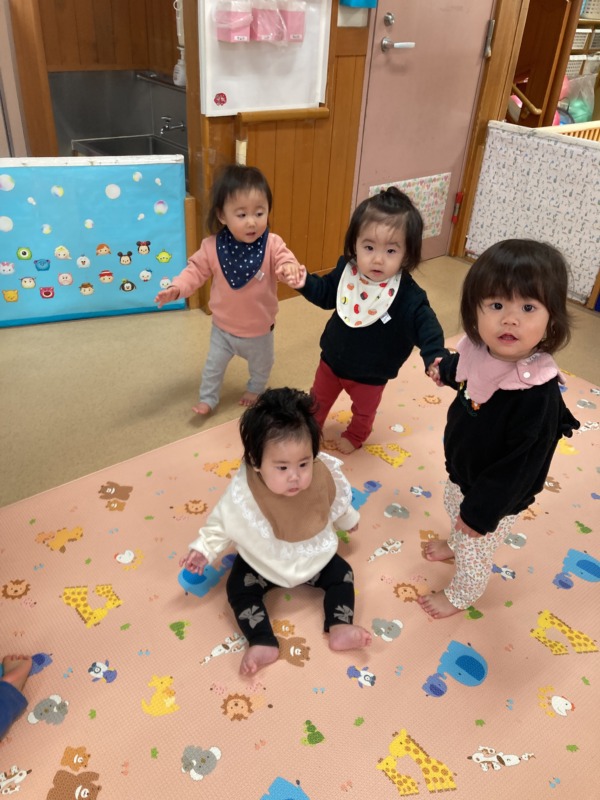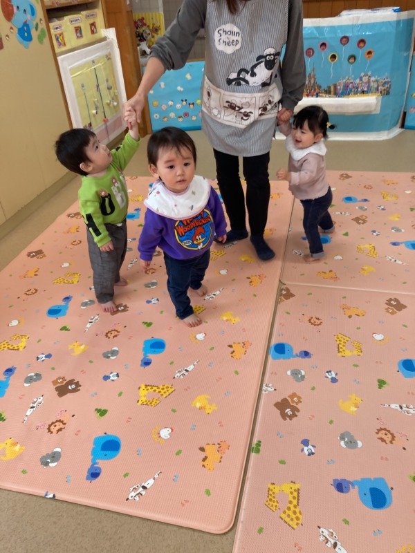 室内で「ハイホー」やしまじろうの「手と手をつないで」トトロの「さんぽ」を流しながらお散歩遊びをすると、保育者や友達と一緒に「手を繋いで嬉しそうに遊ぶ姿が見られます。