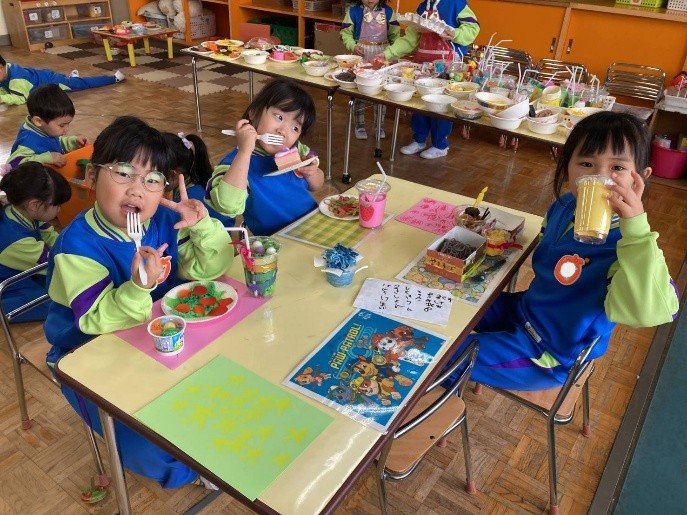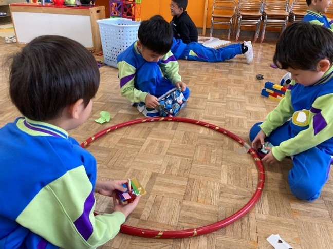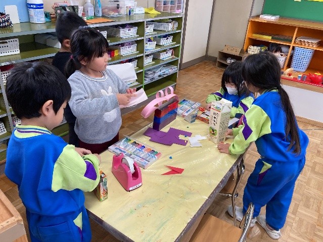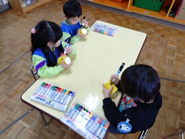 ひまわり組は、レストランごっこを楽しんでいます!自分たちで話し合って、お店屋さんとお客さんに分かれたり、「おすすめはラーメンセットですよ〜」「飲み物は何にしますか〜」とやり取りを楽しんだりしていますよ!お友達や先生と乾杯もしました🍻たんぽぽ組さんは制作遊びやこまバトルを楽しみましたよ。キラキラのテープや画用紙などを使ったり工夫したりしながら、こまの飾りも作りました!