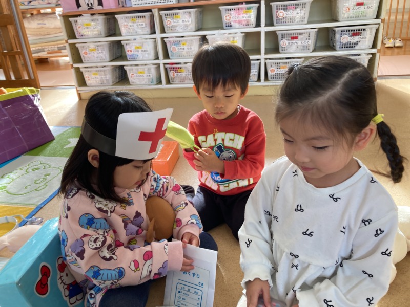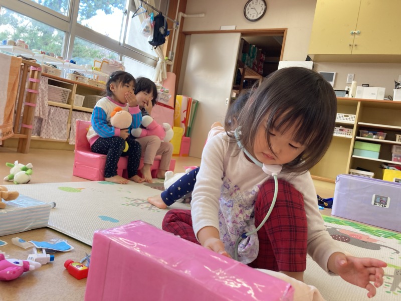 お医者さんごっこでは、聴診器やお薬セットを手に取りながら、役になりきって遊ぶ姿が見られます。