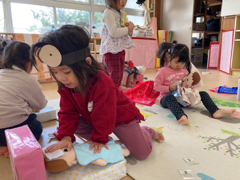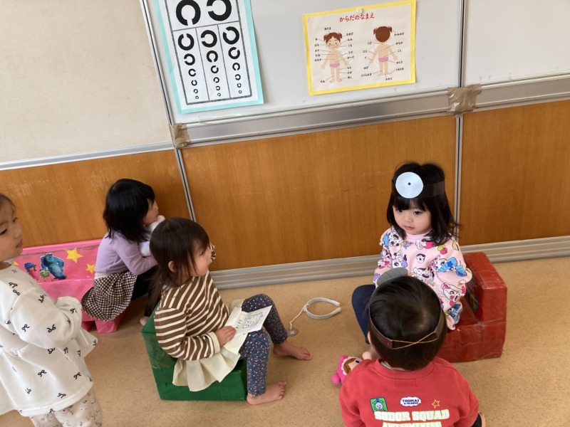 「どこが痛いですか?」「ゴホンゴホン…熱です。」「お大事にしてくださいね~」といった会話が自然に生まれ、まるで本物のお医者さんと患者さんのようなやりとりを楽しんでいます☻