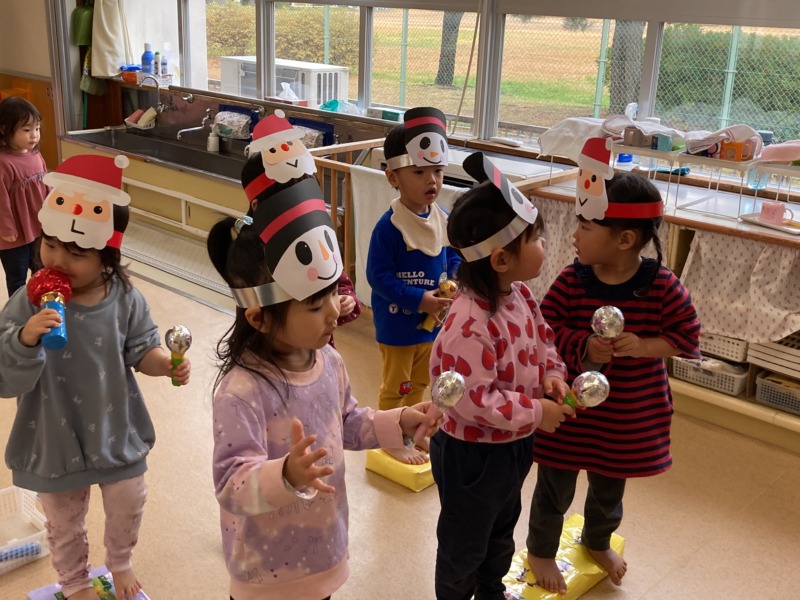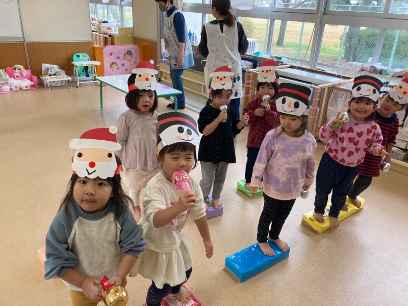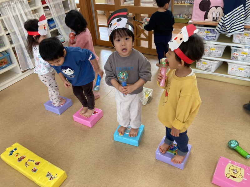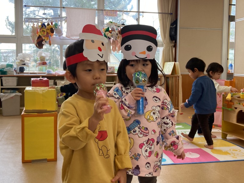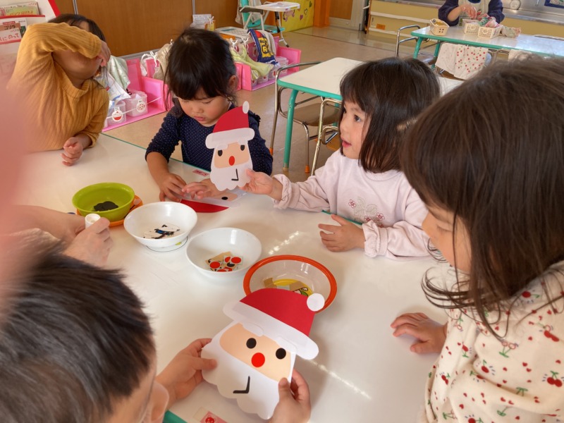 完成したお面をかぶると、気分はすっかりクリスマス♪カラオケコーナーでは、知っている歌が流れると自然と子どもたちが集まり、リズムに合わせて元気いっぱいに歌う姿がとてもかわいらしかったです💞