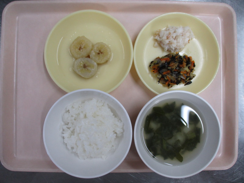 離乳食(後期)の給食は、米がゆ、みそ汁、煮魚(カレイ)、ひじき煮、バナナです。