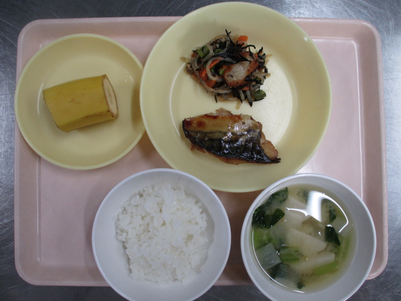 今日の給食は、ごはん、さば照り焼き、ひじきの炒め煮、みそ汁、バナナです。