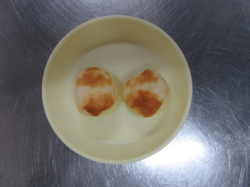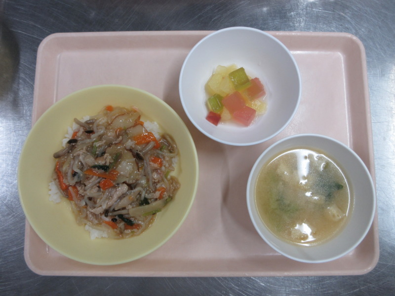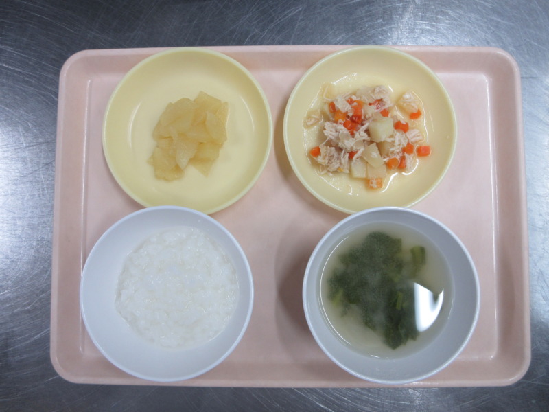 豚丼 今日の給食は、豚丼、みそ汁、ミックスフルーツゼリーです。 大人気の豚丼は、おかわりする子どもが多くあっという間に食べ終わりました!ミックスフルーツゼリーは「大盛りで食べたい~」という声もあり好きな子が多かったです♪ 離乳食(後期)の給食は、米がゆ、みそ汁、鶏じゃが、りんごです。 保育園の手作りおやつはじゃがもちです。