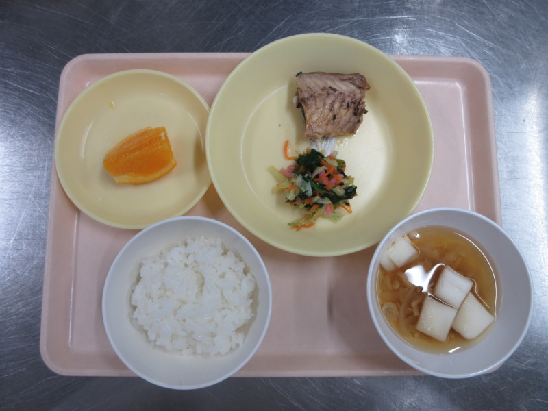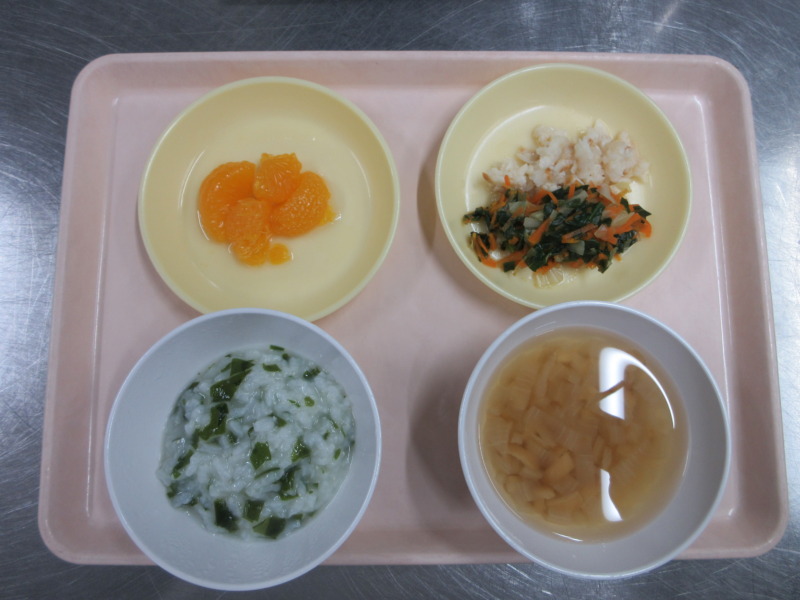 さばの味噌煮 今日の給食は、ごはん、さばの味噌煮、和風和え、すまし汁、オレンジです。 さばの味噌煮は骨まで食べられて栄養満点!ごはんに良く合い、モリモリ残さず食べていました。 すまし汁ははんぺんのやわらかさとえのきの食感が好きな子が多く、よくおかわりして食べていましたよ♪ 離乳食(後期)給食は、わかめがゆ、すまし汁、魚の味噌煮(カレイ)、煮浸し、みかんです。