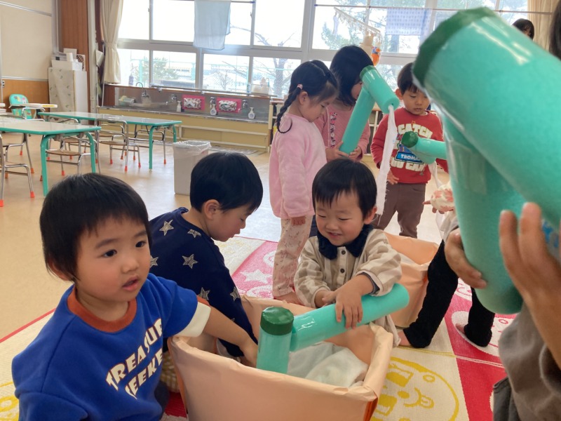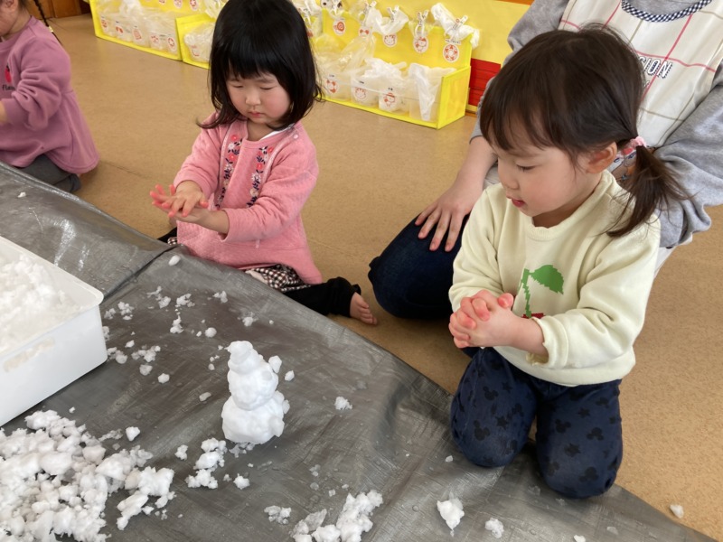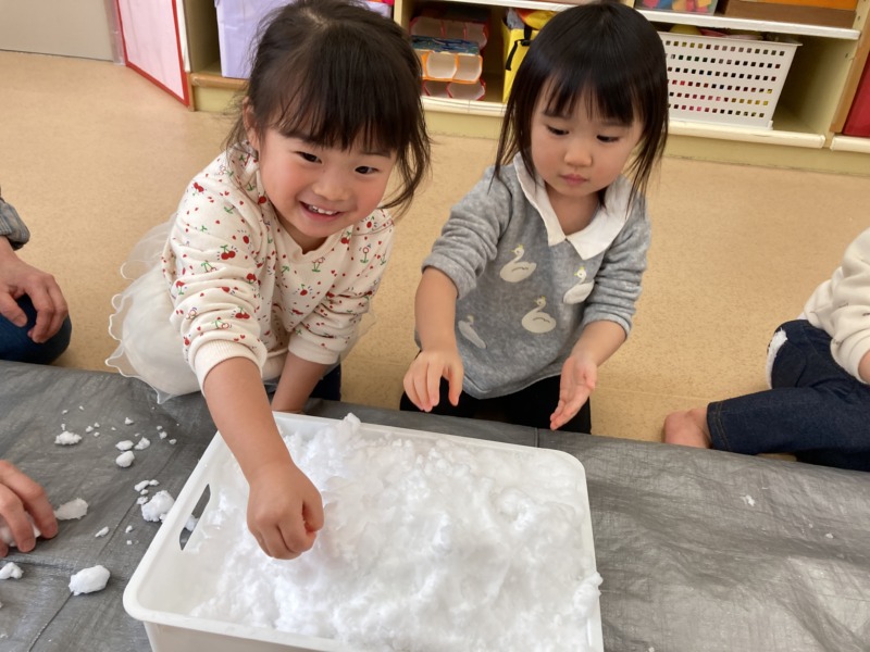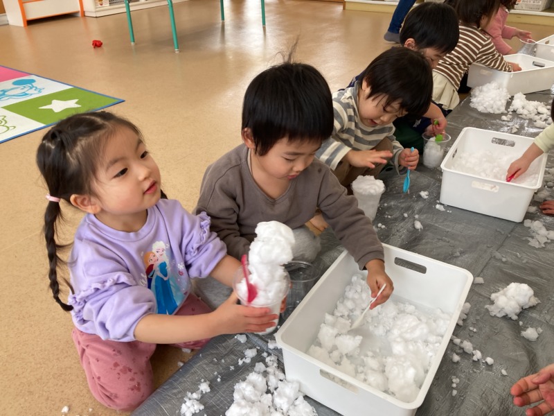 保育室に雪を持ってきて雪遊びをしました☃雪に大興奮の子どもたち。「つめたーい!」と雪の感触を楽しんだり、雪玉を重ねて雪だるまを作ったりして遊んでいましたよ♪プラカップに雪を詰めると、「かき氷になっちゃった!」と、ごっこ遊びも楽しんでいました。