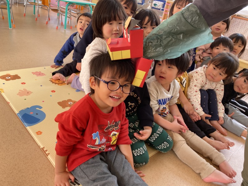 「これな~んだ?」と手作りの獅子舞を見せると、「こわーい…」「ワニみたい!」と様々な反応が。「頭を食べられると良いことがあるんだって!」と話をすると、「食べられたい!」と素直な子どもたちの姿がかわいくて笑ってしまいました😊なぜか「顔を食べられたい」と言う子どももいて面白かったです(笑)