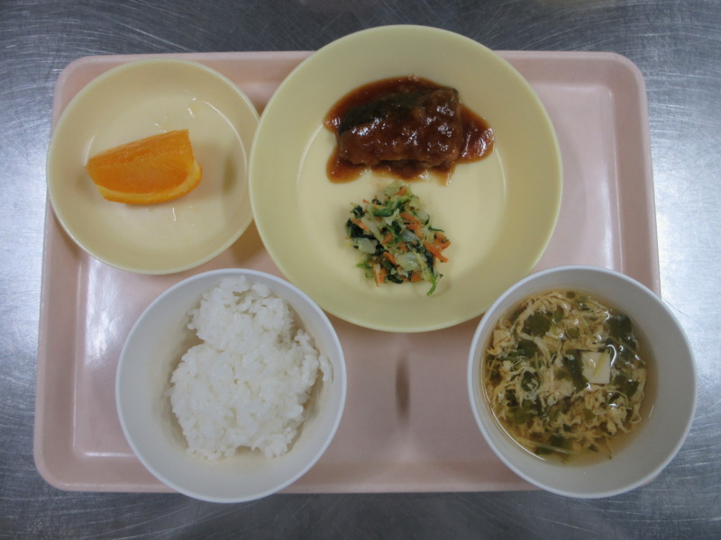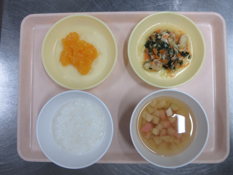 ぶりの揚げ煮 今日の給食は、ごはん、ぶりの揚げ煮、ごまみそ和え、かきたま汁、オレンジです。 お魚、かきたま汁とも人気でした。ごまみそ和えは、野菜が苦手な子も甘みの味付けが食べやすかったようでおかわりして食べていました♪ 離乳食(後期)の給食は、米がゆ、スープ、カレイのみそ野菜煮、みかんです。