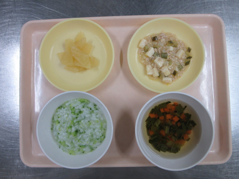 離乳食(後期)の給食は、ブロッコリーがゆ、スープ、野菜麻婆豆腐、りんごです。