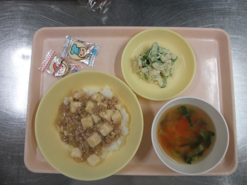 今日の給食は、麻婆丼、ごまマヨサラダ、中華スープ、鉄分チーズです。