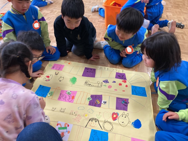 3学期が始まり、久しぶりに会う友達との再会を喜びながら過ごしています。2学期に自分たちで作ったすごろくで遊ぶために、空き箱や画用紙などでコマを作りました。じゃんけんで順番を決めたりルールを教え合ったりと上手に遊んでいますよ☺かるた遊びでは、読み札を一生懸命読んだり、友達よりも早く札を取ろうとしたりしながら楽しんでいます!