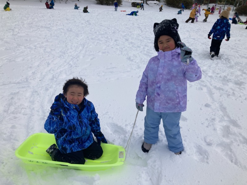 雪遊びも楽しみましたよ!友達と協力して雪だるまを作ったり、米袋のそりで滑ったり、友達をそりに乗せて引っ張ってあげたりしました⛄雪合戦では、遠くからそーっと近付いたり、隠れたりするなど工夫して遊んでいましたよ!