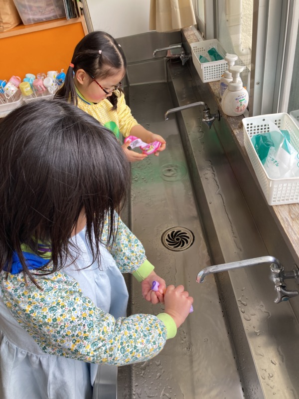 3学期から、給食で自分のおしぼりを使うようになり、自分でしぼることを頑張っています!力を入れてしぼるところが難しそうですが、何回か繰り返すうちに上手になってきましたよ✨年長さんに向けていろいろなことに挑戦中の子どもたちです!!
